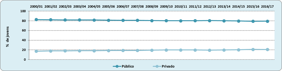 | I22.B Distribuição percentual entre estabelecimentos públicos e privados dos alunos matriculados em modalidades de educação/formação orientadas para jovens, no Continente (2000/01 a 2016/17) | ||||||||||||||||||